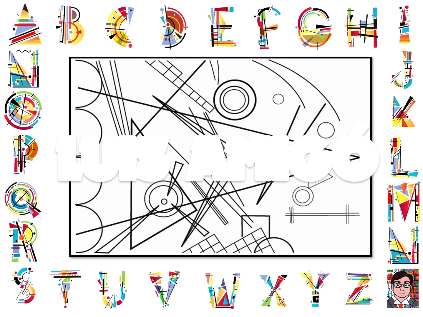 Veamos los pasos del Proceso. Descarga el fichero (publicado en formato .jpg) Imprime la plantilla del trabajo. Tendrás que crear UN CUADRO con las dos palabras LUIS AMIGÓ. Tienes el abecedario, dentro de la lámina, con la estética y tipografías del artista Vasili kandiski. |