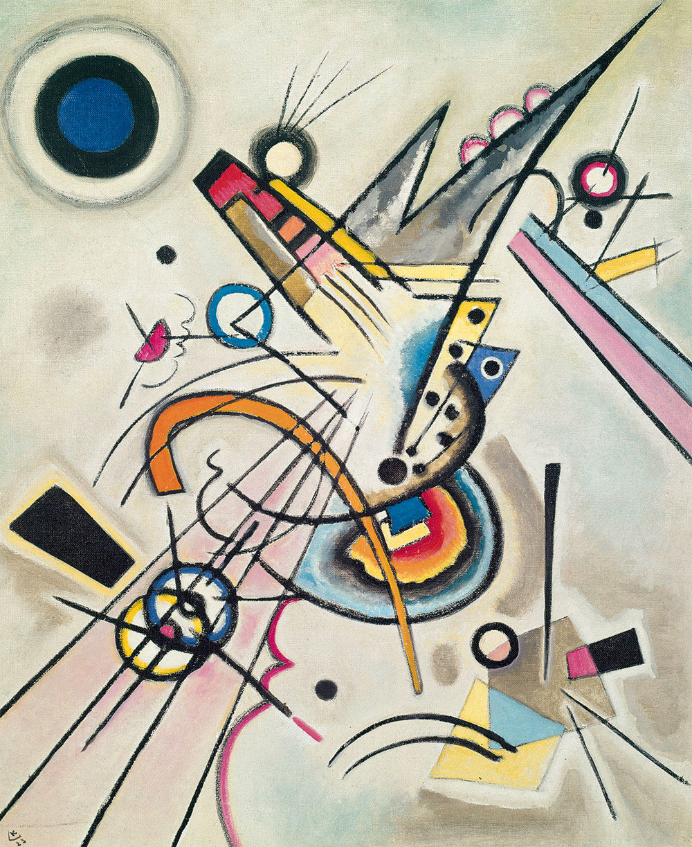 1. Vasili KANDISKI No solo enseñó en las clases de diseño básico para principiantes en el Bauhaus, sino que también llevó a cabo clases de pintura y un taller en el que aumentó su teoría del color con los nuevos elementos de la psicología de la forma. El desarrollo de sus trabajos sobre el estudio de las formas, en particular en los puntos y formas de línea, dio lugar a la publicación de su segundo libro teórico Punto y línea sobre el plano en 1926. Los elementos geométricos adquieren una importancia cada vez mayor tanto en su enseñanza y como en su pintura, especialmente el círculo, medio círculo, el ángulo, las líneas rectas y curvas. Este período fue sumamente productivo. Kandinski fue uno de Die Blaue Vier (Blue Four), formada en 1924 con Paul Klee, Feininger y Alekséi von Jawlensky, que dio conferencias y exhibió en los Estados Unidos en 1924. |